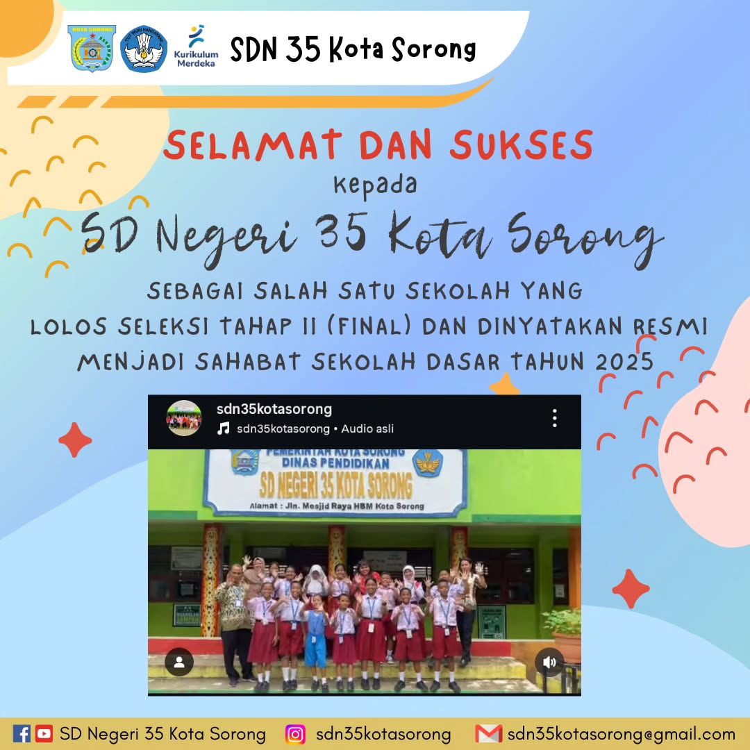 Finalis Program SAHABAT SEKOLAH DASAR 2025 Kota Sorong – SDN 35 Kota Sorong kembali menorehkan prestasi membanggakan. Dimana, SDN 35 berhasil lolos seleksi tahap II (final). Seleksi yang diikuti adalah Program Nasional “SAHABAT SEKOLAH DASAR 2025”. Dimana, program ini diselenggarakan oleh Direktorat Sekolah Dasar, Kementerian Pendidikan, Kebudayaan, Riset, dan Teknologi (Kemendikbudristek). Adapun Program SAHABAT SEKOLAH DASAR bertujuan untuk meningkatkan mutu pendidikan dasar melalui kolaborasi aktif antara sekolah, pemerintah, dan masyarakat. Seleksi dilakukan secara ketat dalam beberapa tahap mulai dari administrasi, presentasi program, hingga verifikasi lapangan. Diharapkan melalui Tahapan Yang dilewati dalam seleksi yang kompetitif maka SDN 35 Kota Sorong dinyatakan lulus seleksi tahap II (final). Sehingga, SDN 35 masuk Final Program SAHABAT SEKOLAH DASAR 2025. Oleh Karena capaian ini merupakan hasil kerja keras seluruh elemen sekolah, dari kepala sekolah, guru, tenaga kependidikan, siswa, serta orang tua siswa. Ada ungkapan syukur dan rasa bangga atas yang disampaikan oleh Kepala SDN 35 Kota Sorong Bapak Natsir Wael S.Pd, atas pencapaian ini. Beliau mengatakan bahwa beliau sangat bersyukur atas hal ini. Dimana menurut Bapak Natsir Wael, S.Pd., adalah “Prestasi ini akan menjadi motivasi kami untuk terus meningkatkan kualitas pembelajaran dan pelayanan pendidikan di sekolah. Apa Itu Program SAHABAT SEKOLAH DASAR? Program SAHABAT SEKOLAH DASAR adalah inisiatif Kemendikbudristek dalam sekolah yang dapat meningkatan kapasitas diri. Program Sahabat Sekolah Dasar bertujuan menciptakan lingkungan belajar yang aman, nyaman, dan mendukung perkembangan karakter peserta didik. Oleh karena itu, penyelenggara Sahabat Sekolah Dasar akan memberikan pendampingan, pelatihan, serta fasilitasi dalam mengembangkan program-program inovatif. Oleh karena itu harapan Kedepananya adalah SDN 35 Kota Sorong menjadi bagian dari jaringan sekolah sahabat. Sehingga dapat berperan aktif dalam berbagi praktik baik dan membangun budaya belajar yang kolaboratif di tingkat nasional. Selanjutnya, kami sangat berharap program ini dapat membawa dampak positif bagi peningkatan kualitas pendidikan. Kami Berharap dapat berdampak di semua sekolah-sekolah dasar lainnya di Kota Sorong dan sekitarnya. Kesimpulan Dengan lolosnya SDN 35 Kota Sorong dalam seleksi final SAHABAT SEKOLAH DASAR 2025 menjadi bukti pecapaian peningkatan mutu sekolah. Selanjutnya juga merupakan bukti komitmen Stackholder sekolah terus bekerja sama dan bersinergi dalam peningkatan mutu pendidikan. Pencapaian ini dapat menjadi inspirasi bagi sekolah-sekolah dasar di Kota Sorong yang ingin berinovasi dan berprestasi. https://www.instagram.com/reel/DMxrHaDBruV/?igsh=MWE3ZXEzdzZsbm01 SDN 35 Kota Sorong, kami berkomitmen dalam mencetak generasi cerdas, berkarakter, dan siap menghadapi tantangan masa depan.