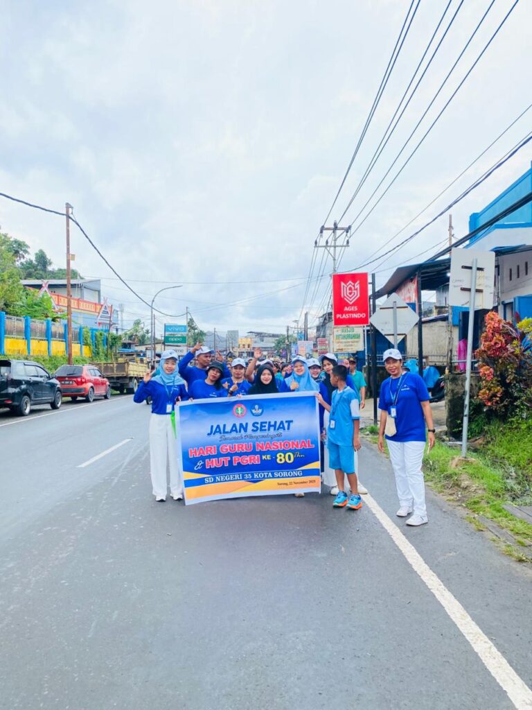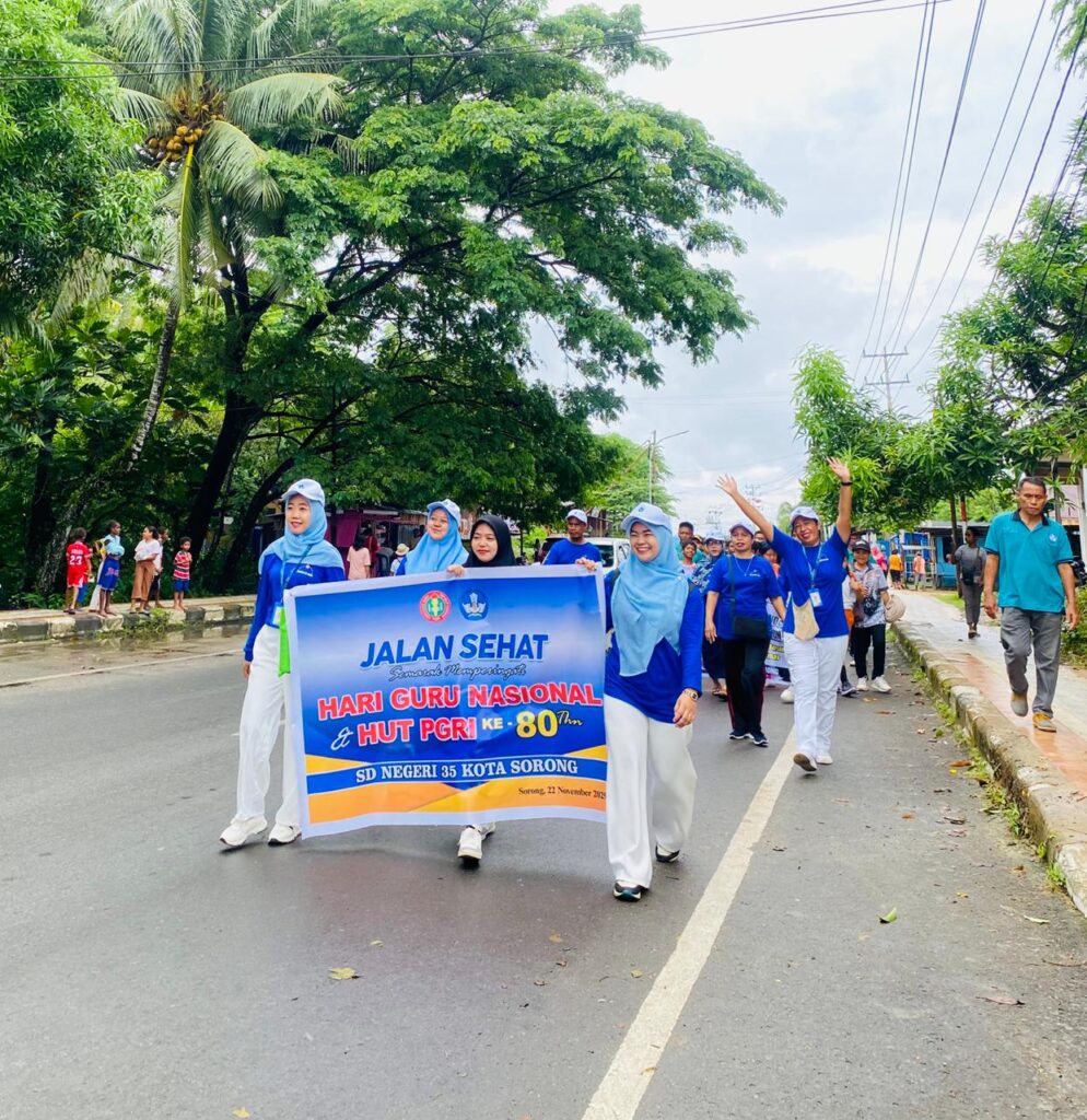 Kota Sorong, 22 November 2025 — Dalam rangka memperingati Hari Guru Nasional ke-80, para guru SDN 35 Kota Sorong turut berpartisipasi dalam kegiatan jalan santai yang diselenggarakan oleh Dinas Pendidikan Kota Sorong pada Sabtu, 22 November 2025. Kegiatan ini berlangsung meriah dan penuh antusiasme sejak pagi hari.